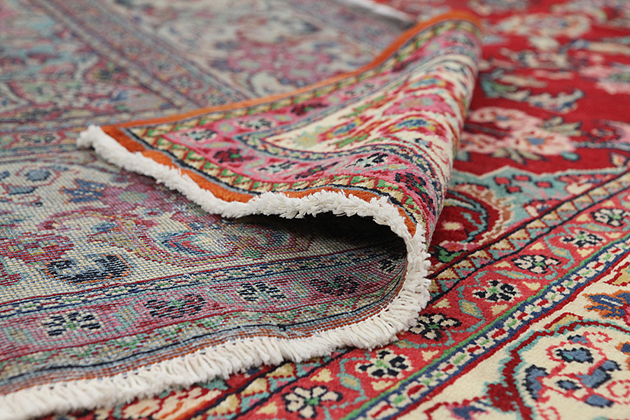 Abrash: Due to the different amount of grease in the wool and the added salt during the process of dyeing, the wool has got a varying colour absorbance. This is not very visible before weaving. During the weaving though, lines of the same colour are formed in the carpet. This is called Abrash (which in Farsi means little cloud) and it shows that the wool was not manufactured using chemical means and marks the naturalness and authenticity of the carpets. Examples