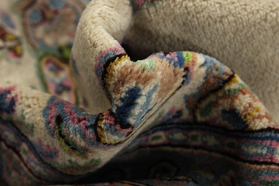 Abrash: Due to the different amount of grease in the wool and the added salt during the process of dyeing, the wool has got a varying colour absorbance. This is not very visible before weaving. During the weaving though, lines of the same colour are formed in the carpet. This is called Abrash (which in Farsi means little cloud) and it shows that the wool was not manufactured using chemical means and marks the naturalness and authenticity of the carpets. Examples