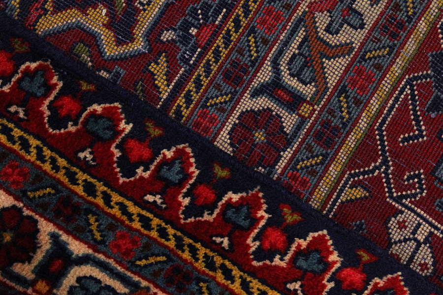 Abrash: Due to the different amount of grease in the wool and the added salt during the process of dyeing, the wool has got a varying colour absorbance. This is not very visible before weaving. During the weaving though, lines of the same colour are formed in the carpet. This is called Abrash (which in Farsi means little cloud) and it shows that the wool was not manufactured using chemical means and marks the naturalness and authenticity of the carpets. Examples