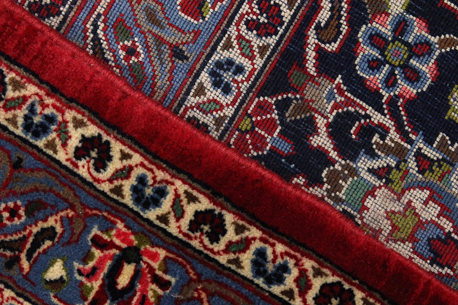 Abrash: Due to the different amount of grease in the wool and the added salt during the process of dyeing, the wool has got a varying colour absorbance. This is not very visible before weaving. During the weaving though, lines of the same colour are formed in the carpet. This is called Abrash (which in Farsi means little cloud) and it shows that the wool was not manufactured using chemical means and marks the naturalness and authenticity of the carpets. Examples