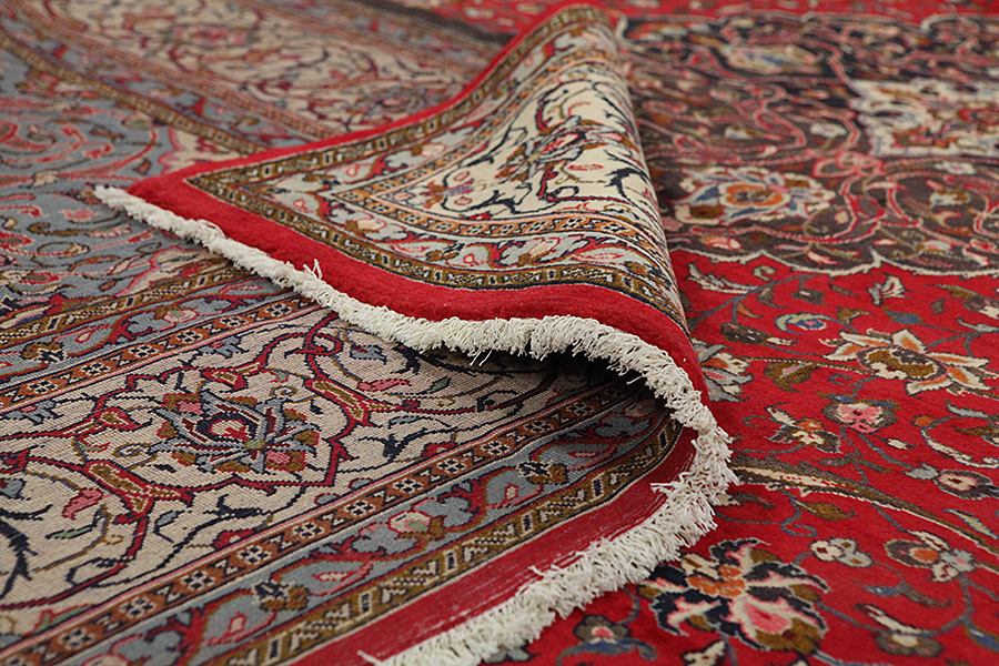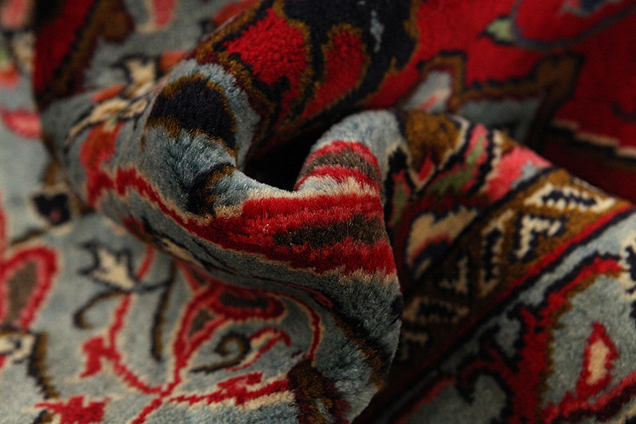 Abrash: Due to the different amount of grease in the wool and the added salt during the process of dyeing, the wool has got a varying colour absorbance. This is not very visible before weaving. During the weaving though, lines of the same colour are formed in the carpet. This is called Abrash (which in Farsi means little cloud) and it shows that the wool was not manufactured using chemical means and marks the naturalness and authenticity of the carpets. Examples