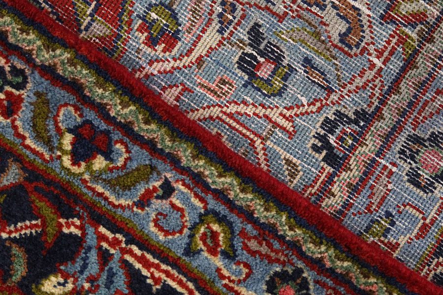 Abrash: Due to the different amount of grease in the wool and the added salt during the process of dyeing, the wool has got a varying colour absorbance. This is not very visible before weaving. During the weaving though, lines of the same colour are formed in the carpet. This is called Abrash (which in Farsi means little cloud) and it shows that the wool was not manufactured using chemical means and marks the naturalness and authenticity of the carpets. Examples