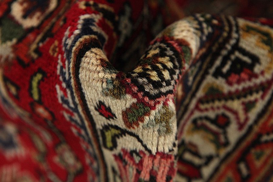 Abrash: Due to the different amount of grease in the wool and the added salt during the process of dyeing, the wool has got a varying colour absorbance. This is not very visible before weaving. During the weaving though, lines of the same colour are formed in the carpet. This is called Abrash (which in Farsi means little cloud) and it shows that the wool was not manufactured using chemical means and marks the naturalness and authenticity of the carpets. Examples