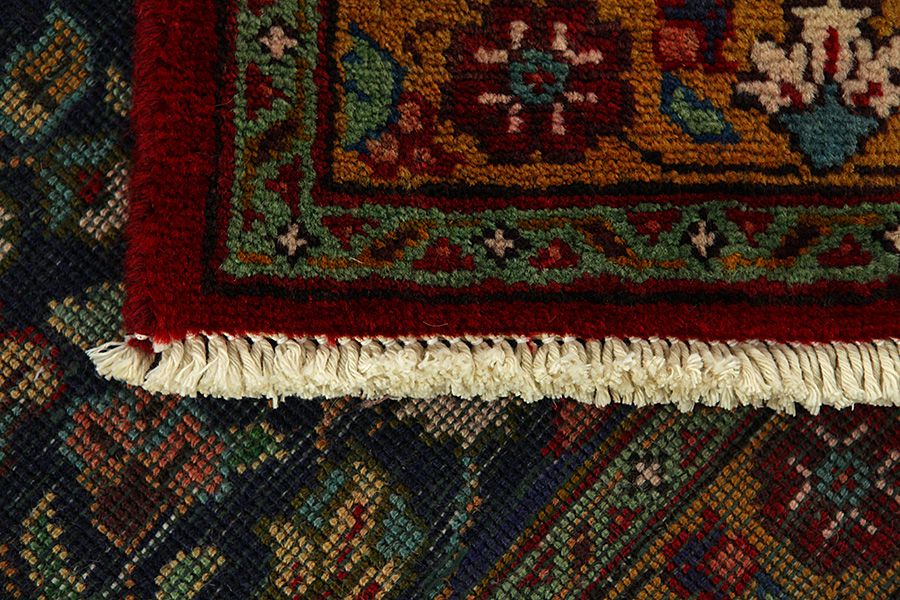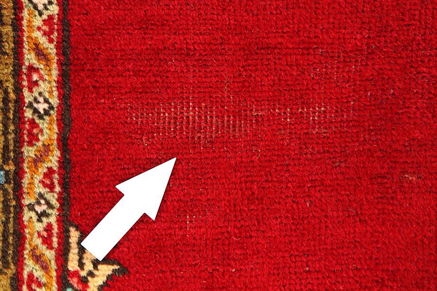 Abrash: Due to the different amount of grease in the wool and the added salt during the process of dyeing, the wool has got a varying colour absorbance. This is not very visible before weaving. During the weaving though, lines of the same colour are formed in the carpet. This is called Abrash (which in Farsi means little cloud) and it shows that the wool was not manufactured using chemical means and marks the naturalness and authenticity of the carpets. Examples