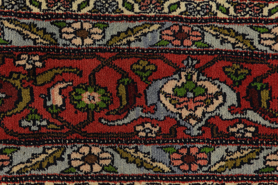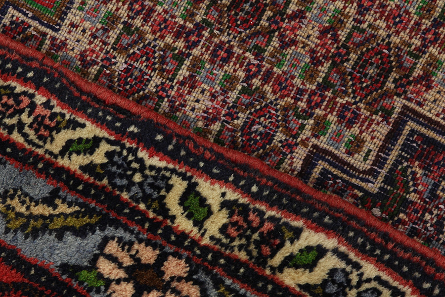 Abrash: Due to the different amount of grease in the wool and the added salt during the process of dyeing, the wool has got a varying colour absorbance. This is not very visible before weaving. During the weaving though, lines of the same colour are formed in the carpet. This is called Abrash (which in Farsi means little cloud) and it shows that the wool was not manufactured using chemical means and marks the naturalness and authenticity of the carpets. Examples