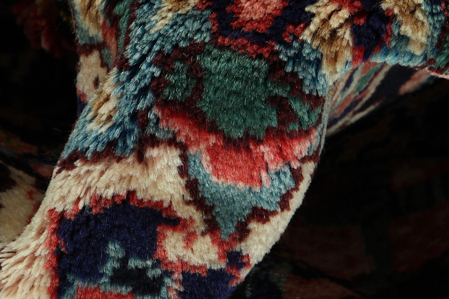 Abrash: Due to the different amount of grease in the wool and the added salt during the process of dyeing, the wool has got a varying colour absorbance. This is not very visible before weaving. During the weaving though, lines of the same colour are formed in the carpet. This is called Abrash (which in Farsi means little cloud) and it shows that the wool was not manufactured using chemical means and marks the naturalness and authenticity of the carpets. Examples