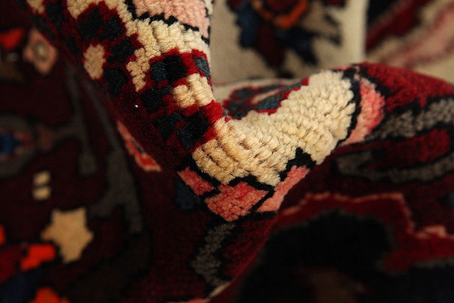 Abrash: Due to the different amount of grease in the wool and the added salt during the process of dyeing, the wool has got a varying colour absorbance. This is not very visible before weaving. During the weaving though, lines of the same colour are formed in the carpet. This is called Abrash (which in Farsi means little cloud) and it shows that the wool was not manufactured using chemical means and marks the naturalness and authenticity of the carpets. Examples