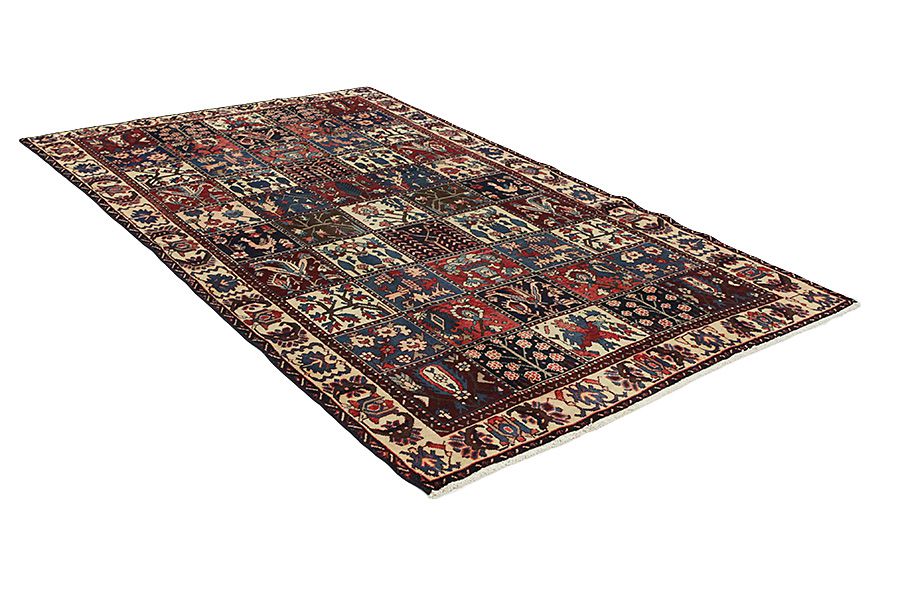 Bakhtiari Carpets : In the mountains Zagros, west of the city of Isfahan, around the town of Shahr-e-Kurd, live the nomads Bakhtiar. Their carpets are known for the design with various repeating squares in which flowers and animals are depicted. For this reason the design is called "garden"(Khesti). Their carpets are very durable with a dense weave and very good quality Persian wool coming from sheep grazing at a high altitude. The best Bakhtiar rugs and carpets with highest knot density are often called Bibibaff. Also in many designs we see influences from Isfahan carpets. (Boldaji - Feridan - Saman).