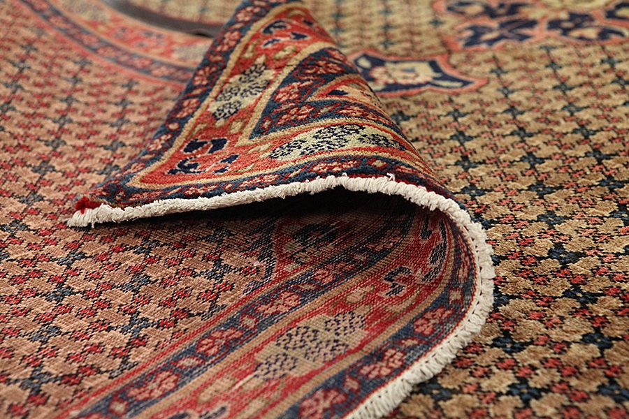 Abrash: Due to the different amount of grease in the wool and the added salt during the process of dyeing, the wool has got a varying colour absorbance. This is not very visible before weaving. During the weaving though, lines of the same colour are formed in the carpet. This is called Abrash (which in Farsi means little cloud) and it shows that the wool was not manufactured using chemical means and marks the naturalness and authenticity of the carpets. Examples