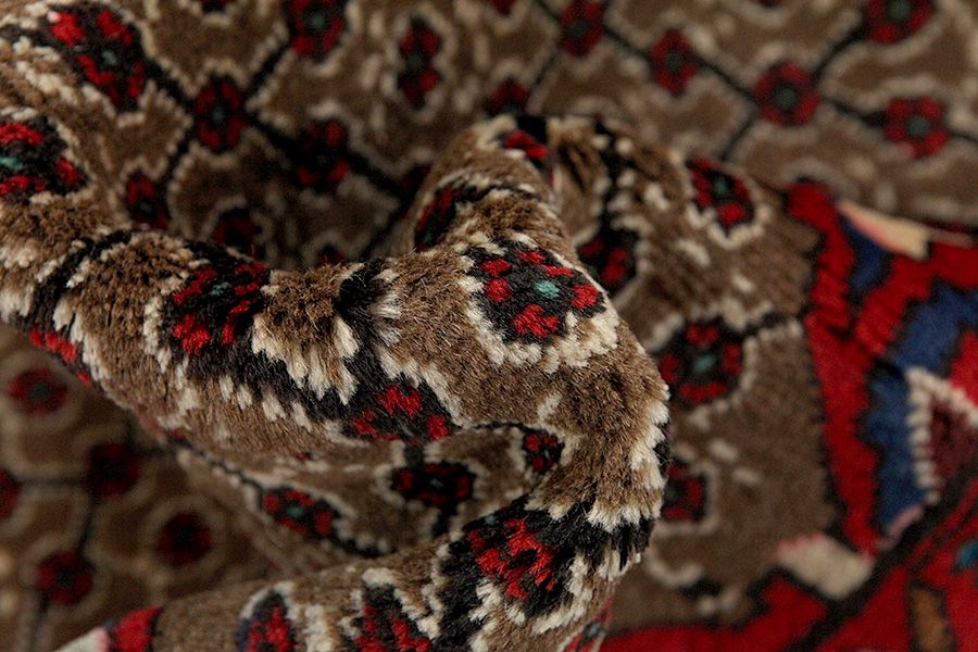 Abrash: Due to the different amount of grease in the wool and the added salt during the process of dyeing, the wool has got a varying colour absorbance. This is not very visible before weaving. During the weaving though, lines of the same colour are formed in the carpet. This is called Abrash (which in Farsi means little cloud) and it shows that the wool was not manufactured using chemical means and marks the naturalness and authenticity of the carpets. Examples