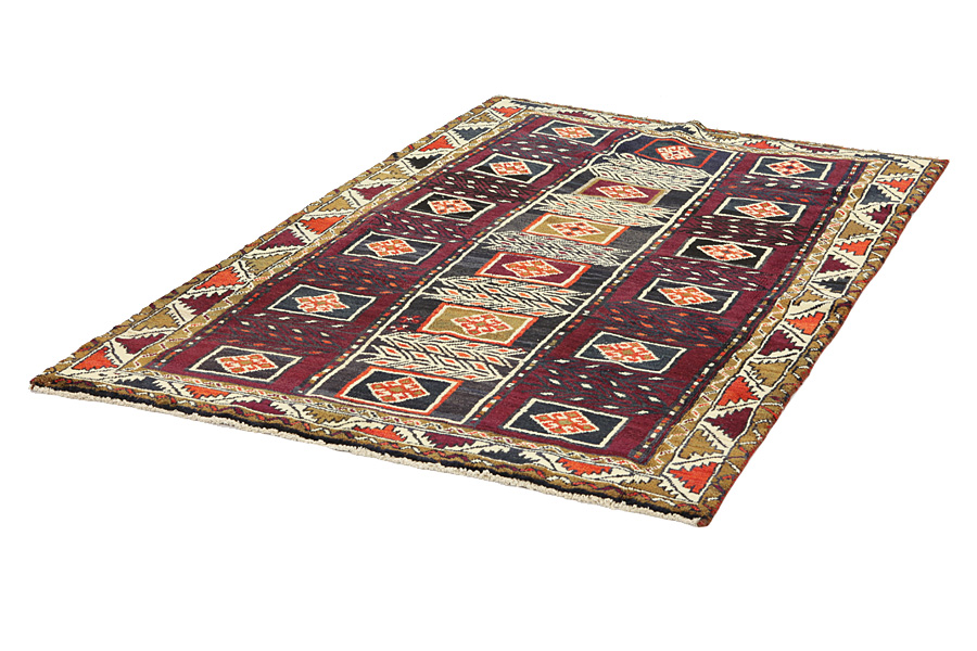 Qashqai Carpets : Qashqai carpets are woven by nomads who live in the mountainous areas of Southwest Persia, the provinces of Fars, Khuzestan, south of Isfahan and around the city Shiraz. Their carpets have a high knot density and a wide variety of designs, usually in deep red and blue colors. They weave carpets, Kilims and decorative textiles (ribbons, bags, etc.), which depict scenes from their lives with various representation of humans, animals, birds, trees and flowers. They also depict historical monuments, mostly from Persepolis.