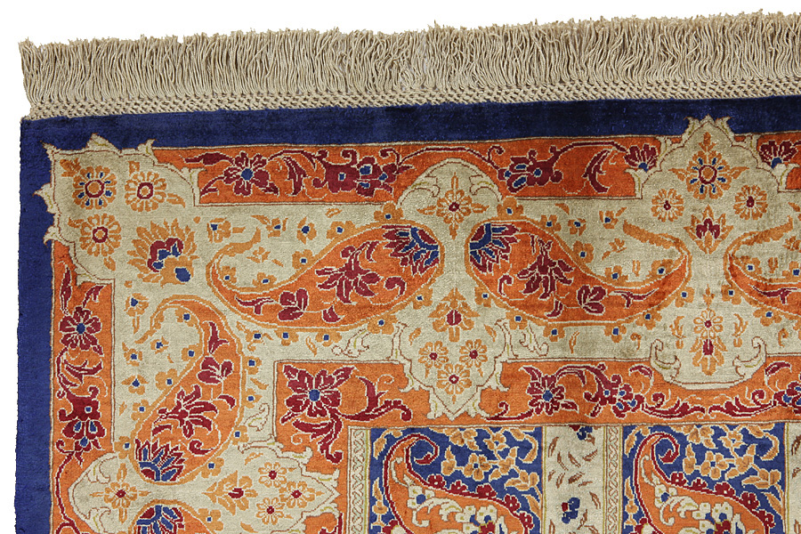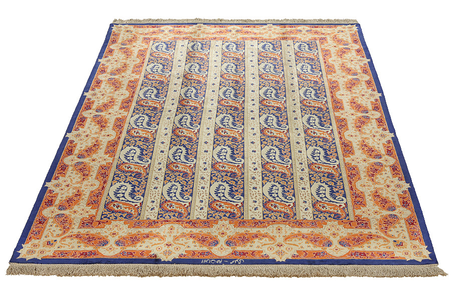 Qum Carpets : The weaving of Qum carpets began on a large scale in the 1930's and they have experimented with various designs of old carpets such as Senna, Kashan, Isfahan and other renowned Persian carpets. A new generation of designers created new designs with rare colors for Persian carpets, like light green and turquoise-blue. This way Qum carpets developed an original character of their own. Among the many famous projects is the Garden: a design with several repeated blocks, within which are depicted flowers or animals (images of birds, winged lions, and dragons), old Persian hunting representations or various historical scenes. Prayer carpets with various religious themes are also well known. The carpets have a high knot density and high class materials. Silk and fine quality wool establish them as very high quality carpets.