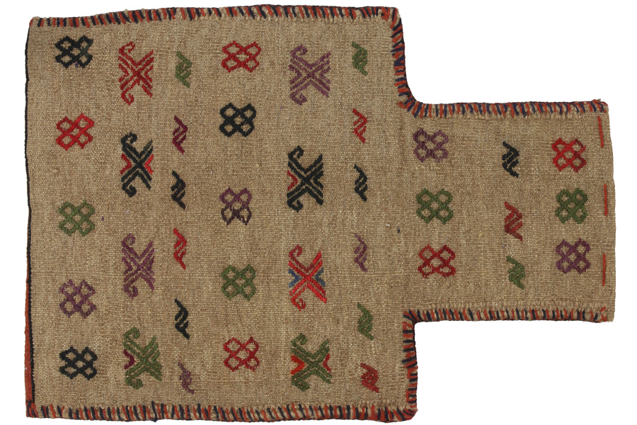 Saddle Bag Carpets : ​Horse saddle bags are made by Nomads for their own use. One can distinguish between the kilim-horse saddle bags and the knotted horse saddle bags. The front side of a knotted horse saddle bag is either knotted like a common carpet with knots or different mixed techniques are used. The side parts are often woven whereas in the middle part different weaving techniques such as kelim or Soumak are applied. The colors horse bags are dyed with are all natural and made by the Nomads themselves. Bags like these once carried everyday necessities for travelers on donkeys or horses. A delightful piece of art that provides a unique oriental atmosphere to your home. Horse saddle bags can be used as a seat cushion, as a floor cushion eg in front of your fireplace or as a wall decoration. Smaller horse saddle bags can be used as a newspaper holder to store newspapers or magazines when slung over a chair or sofa.