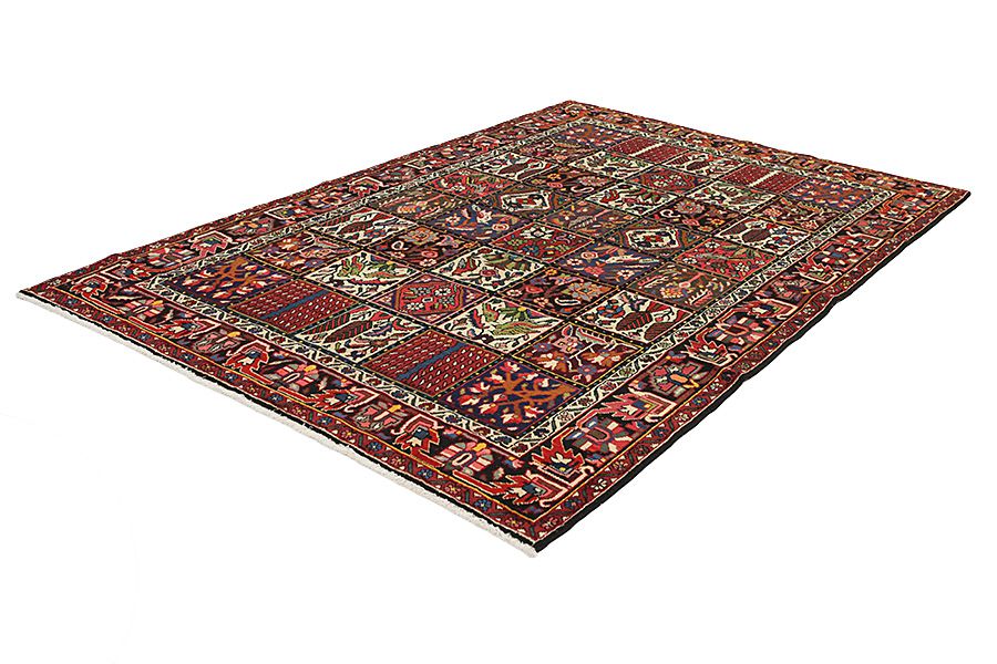 Bakhtiari Carpets : In the mountains Zagros, west of the city of Isfahan, around the town of Shahr-e-Kurd, live the nomads Bakhtiar. Their carpets are known for the design with various repeating squares in which flowers and animals are depicted. For this reason the design is called "garden"(Khesti). Their carpets are very durable with a dense weave and very good quality Persian wool coming from sheep grazing at a high altitude. The best Bakhtiar rugs and carpets with highest knot density are often called Bibibaff. Also in many designs we see influences from Isfahan carpets. (Boldaji - Feridan - Saman).