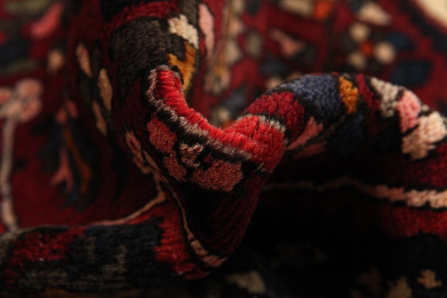 Abrash: Due to the different amount of grease in the wool and the added salt during the process of dyeing, the wool has got a varying colour absorbance. This is not very visible before weaving. During the weaving though, lines of the same colour are formed in the carpet. This is called Abrash (which in Farsi means little cloud) and it shows that the wool was not manufactured using chemical means and marks the naturalness and authenticity of the carpets. Examples