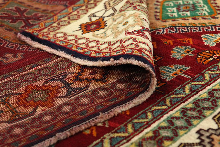 Qashqai Carpets : Qashqai carpets are woven by nomads who live in the mountainous areas of Southwest Persia, the provinces of Fars, Khuzestan, south of Isfahan and around the city Shiraz. Their carpets have a high knot density and a wide variety of designs, usually in deep red and blue colors. They weave carpets, Kilims and decorative textiles (ribbons, bags, etc.), which depict scenes from their lives with various representation of humans, animals, birds, trees and flowers. They also depict historical monuments, mostly from Persepolis.