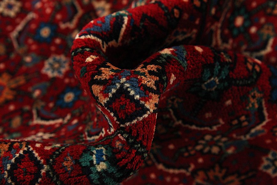 Abrash: Due to the different amount of grease in the wool and the added salt during the process of dyeing, the wool has got a varying colour absorbance. This is not very visible before weaving. During the weaving though, lines of the same colour are formed in the carpet. This is called Abrash (which in Farsi means little cloud) and it shows that the wool was not manufactured using chemical means and marks the naturalness and authenticity of the carpets. Examples